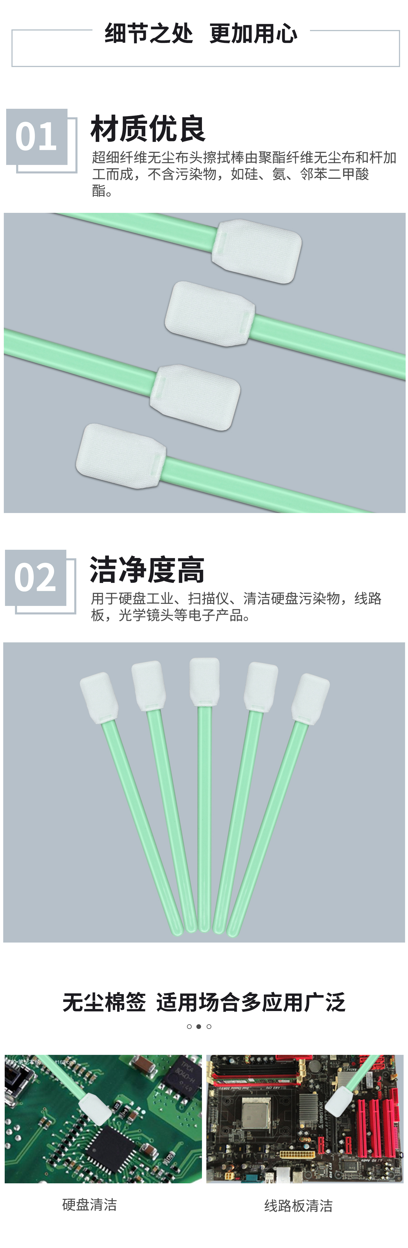 棉签用途:防静电净化擦拭棒广泛应用于硬盘工业、光学仪器、镜片镜头、打印机、扫描仪、芯片、化验室、平面显示等电子领域。