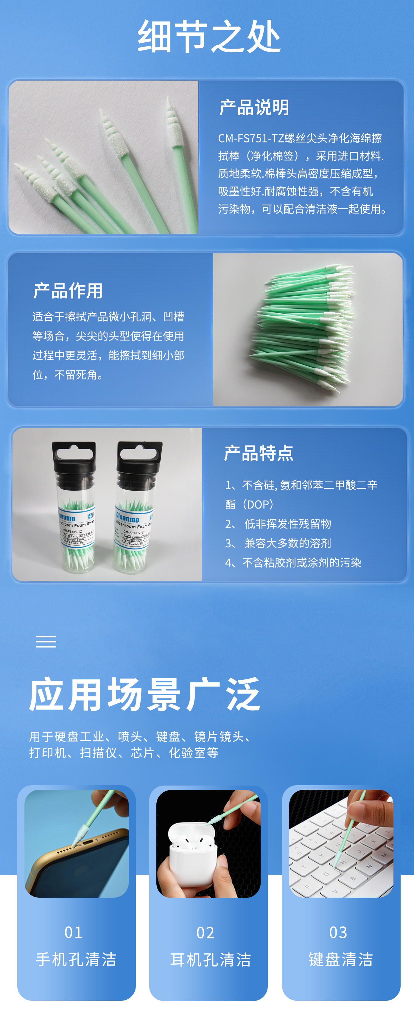 CM-FS751-TZ布头棉签主要用在精密电子加工,半导体HDD、微电子、集成电路、精密仪器、精密电子、光学产品、液晶显示器,触摸屏,手机屏,导光板,电容屏加工,LED封装,显微镜,摄像头,光电、航天、医药保养、医疗美容、家居等各行各业,电子工业用助剂载体(可以沾酒精、丙酮,等多种溶剂来擦拭产品等),海绵棉签,无尘防静电产品,安全防护用品,实验室用品,作业保护用品,塑胶制品,竹制、木制的日用工艺品,个人医用护理品、保健用品,消毒载体用产品,除了用来擦拭产品的边角、缝隙、平面外,也用于其他用途的擦拭。 无尘净化海绵头棉签的产品特点是头部采用全开孔海绵,也有闭孔海绵头棉签,并经无尘清洗。